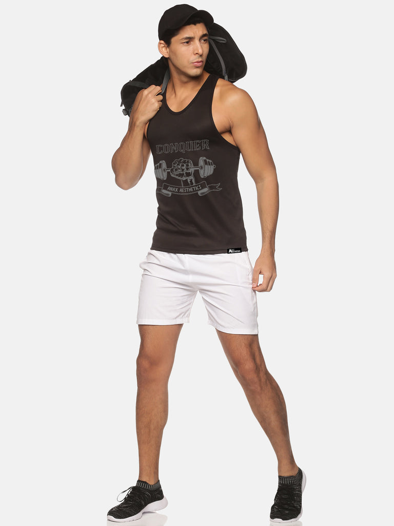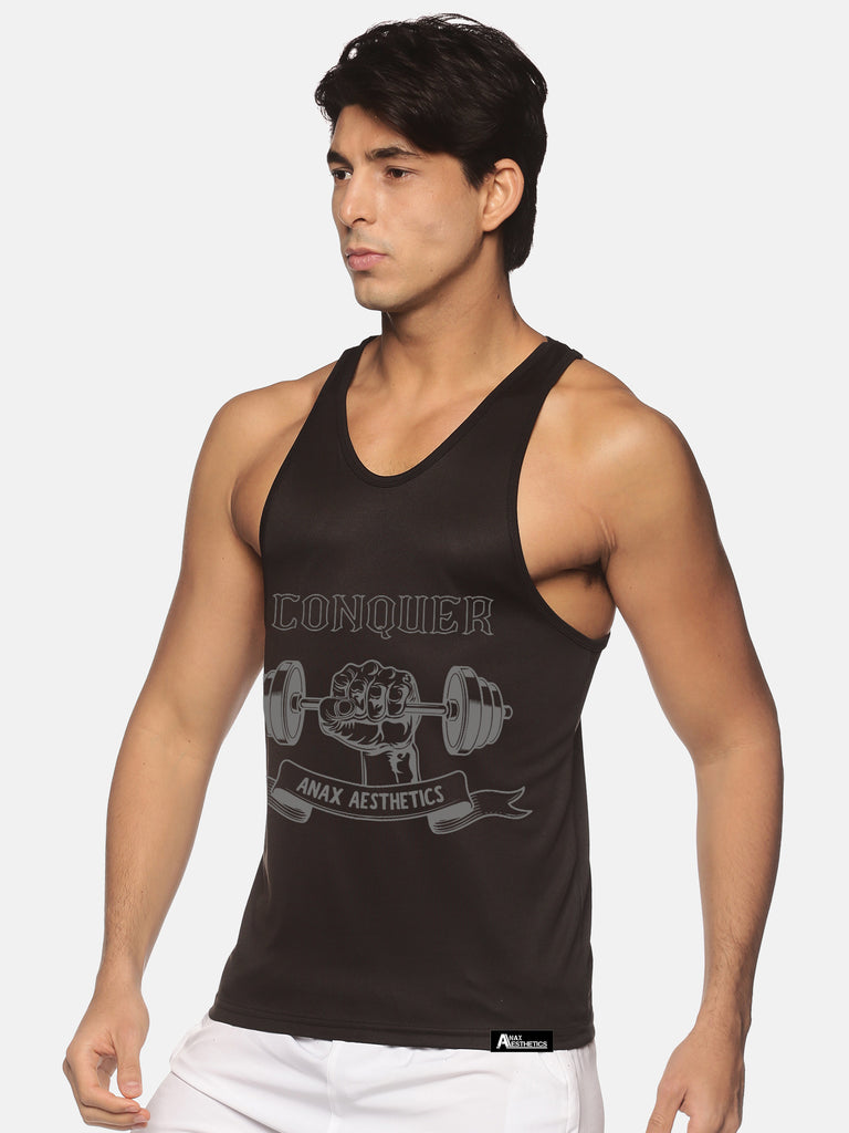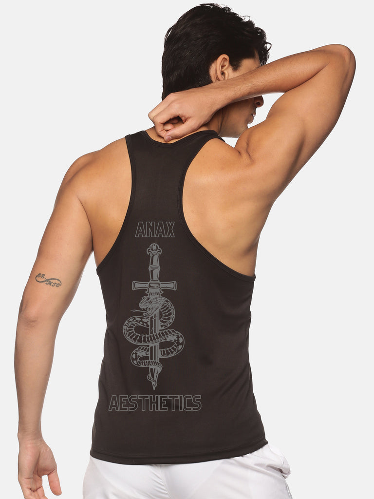 This stringer made by ANAX AESTHETICS is suitable for all the athletes who like to sweat it in the gym or wear it outdoors while performing cardio or any other sports activity. The black color with grey sublimation print gives the stringer a vibrant look and the dry-tuff sweat absorbent material of the stringer keeps you cool and will make you feel comfortable throughout your workout.