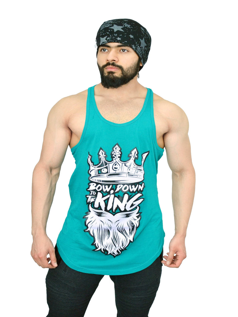 PRODUCT DETAIL – Caribbean Teal color stringer with a crown & beard ( bow down to the King ) on the front, shield & spears ( brand name Anax Aesthetics & A.X.A.S ) written within it is printed with white color on the back.