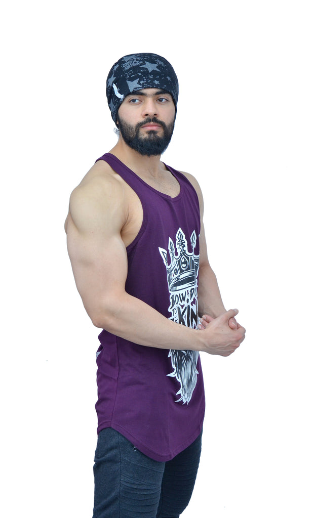 PRODUCT DETAIL – Concord Purple color stringer with a crown & beard ( bow down to the King ) on the front, shield & spears ( brand name Anax Aesthetics & A.X.A.S ) written within it is printed with black color on the back.