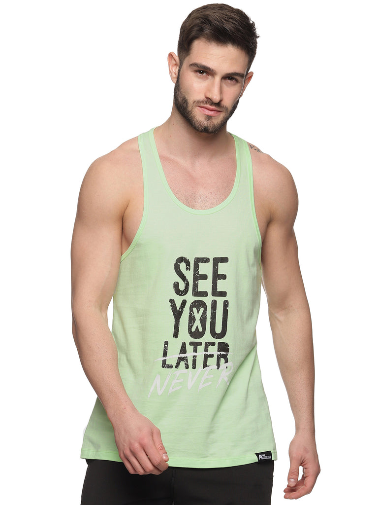 These stringers are a staple for gym and the 100% lightweight cotton along with deep armhole provides complete range of motion and breathability to your body. The amazing graphic prints give the stringer a sleek, aesthetic and catchy looks and thus come out to be a must purchase for your workouts. SEE YOU LATER NEVER print on the front of the amazing pastel color vest is just simple class .The stringer has a low sleeve cut and is light, comfortable and stylish.100% Lightweight Cotton